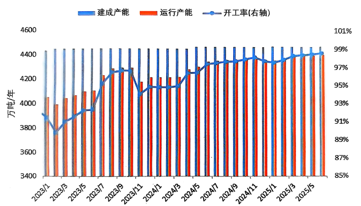 2025上半年,中國鋁行業(yè)生產(chǎn)總體較為穩(wěn)定,沒有出現(xiàn)因各種不可抗力因素導致的規(guī);瘻p產(chǎn),且隨著四川、貴州、青海等省/區(qū)電解鋁企業(yè)的復產(chǎn)和新建項目投產(chǎn),上半年生產(chǎn)能力得到持續(xù)提升。安泰科統(tǒng)計,截至2025年6月底,中國電解鋁建成產(chǎn)能4470萬噸/年,其中運行產(chǎn)能4405萬噸/年,較2024年底增加49萬噸。1-6月份產(chǎn)能利用率達98.1%,不斷刷新歷史新高,比去年同期高2.4個百分點:其中6月份產(chǎn)能利用率達98.5%,較2024年末高0.9個百分點。2025上半年,中國電解鋁產(chǎn)量約為2184萬噸,同比增加2.4%。
