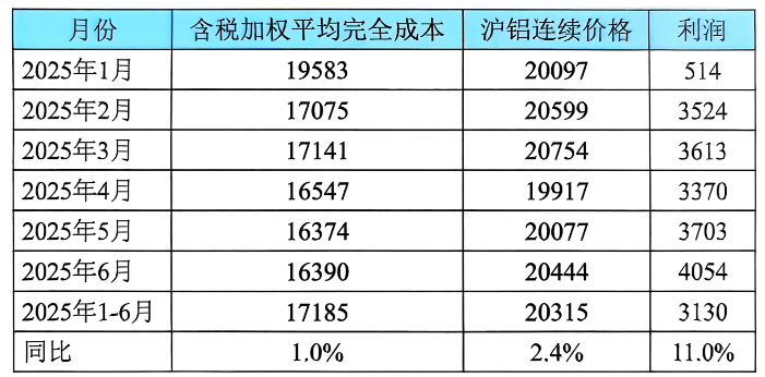 表1-2 2025上半年中國電解鋁成本和盈利情況