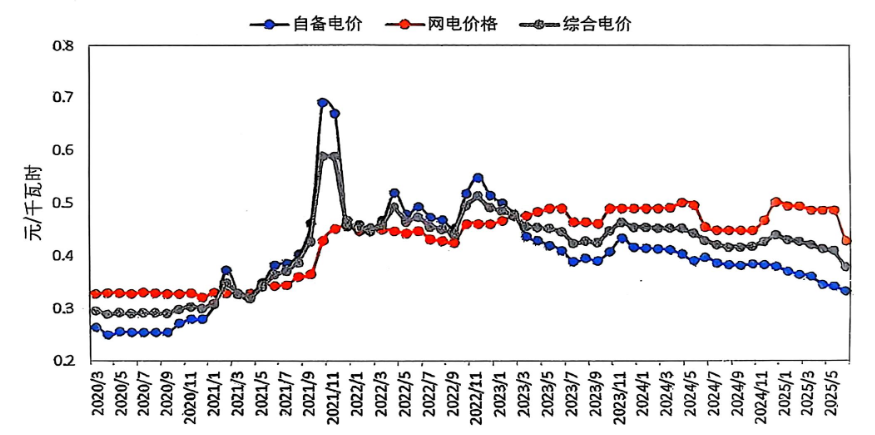 電力成本下降。截至6月底,中國電解鋁運行產(chǎn)能中的自備電比例約55%;網(wǎng)電比例約45%。煤炭價格的持續(xù)下滑導致鋁企自備電價降低是2025年以來電解鋁行業(yè)電力成本下降的主要原因。2025年以來,煤炭主產(chǎn)區(qū)煤礦復產(chǎn)節(jié)奏加快,進口煤到港量維持高位;而電煤因暖冬影響需求疲軟,非電行業(yè)又處于淡季,煤炭供應寬松但需求疲軟,導致煤炭價格呈下行態(tài)勢,鋁廠自備電價逐步下跌。此外,廣西、云南、四川等地區(qū)網(wǎng)電價格均有不同程度的下調(diào),進一步促進了鋁企電力成本的下降。根據(jù)安泰科統(tǒng)計,2025年6月份自備電加權(quán)平均價格為0.332元/千瓦時,較2024年末下降0.048元/千瓦時,較2024年同期下降0.065元/千瓦時;網(wǎng)電價格為0.428元/千瓦時,較2024年末下降0.074元/千瓦時,較2024年同期下降0.0276元/千瓦時;綜合加權(quán)平均電價為0.379元/千瓦時,較2024年末下降0.0507元/千瓦時。1-6月份綜合加權(quán)平均電價為0.414元/千瓦時,同比下降0.034元/千瓦時。
