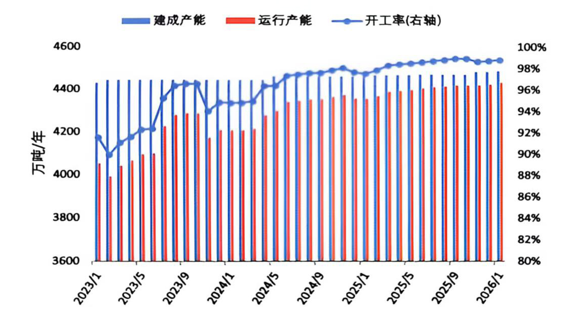 2026年1月,國(guó)內(nèi)電解鋁建成產(chǎn)能與運(yùn)行產(chǎn)能均維持高位運(yùn)行。截至1月底,建成產(chǎn)能4488萬(wàn)噸/年,運(yùn)行產(chǎn)能4434萬(wàn)噸/年,環(huán)比增加9萬(wàn)噸/年,整體產(chǎn)能規(guī)模保持穩(wěn)定,運(yùn)行產(chǎn)能小幅提升。2026年年初,電投能源旗下扎哈淖爾電解鋁二期項(xiàng)目35萬(wàn)噸/年進(jìn)入試生產(chǎn)階段,待項(xiàng)目全面投產(chǎn)后,該公司電解鋁總產(chǎn)能將達(dá)到161萬(wàn)噸;1月上旬,包鋁電解一廠完成1182號(hào)電解槽啟動(dòng),全系列1166臺(tái)電解槽全部運(yùn)行,生產(chǎn)線實(shí)現(xiàn)滿負(fù)荷生產(chǎn);同期,天山鋁業(yè)140萬(wàn)噸電解鋁綠色低碳能效提升改造項(xiàng)目產(chǎn)能逐步釋放。當(dāng)前國(guó)內(nèi)產(chǎn)能已接近“天花板”,行業(yè)開(kāi)工率維持在98%以上,后續(xù)產(chǎn)量釋放與產(chǎn)能擴(kuò)張均已逼近極限。